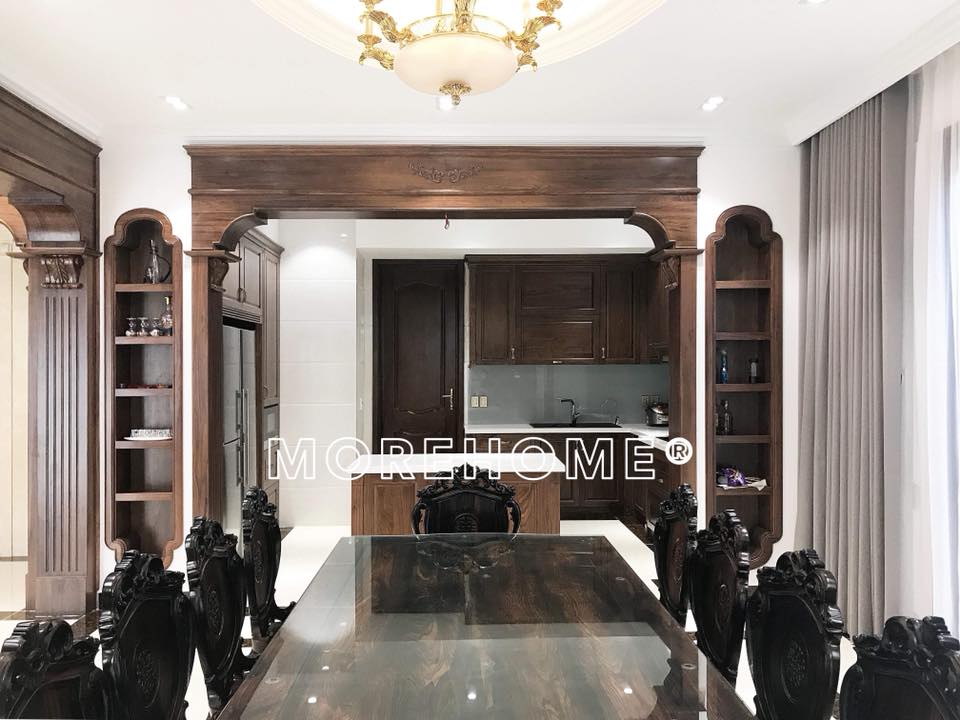Nội thất đồ gỗ óc chó có mặt khắp góc tường, từ các vách ốp của căn biệt thự cụng sử dụng vách ốp gỗ óc chó cao cấp với các đường chạm khắc tinh tế.