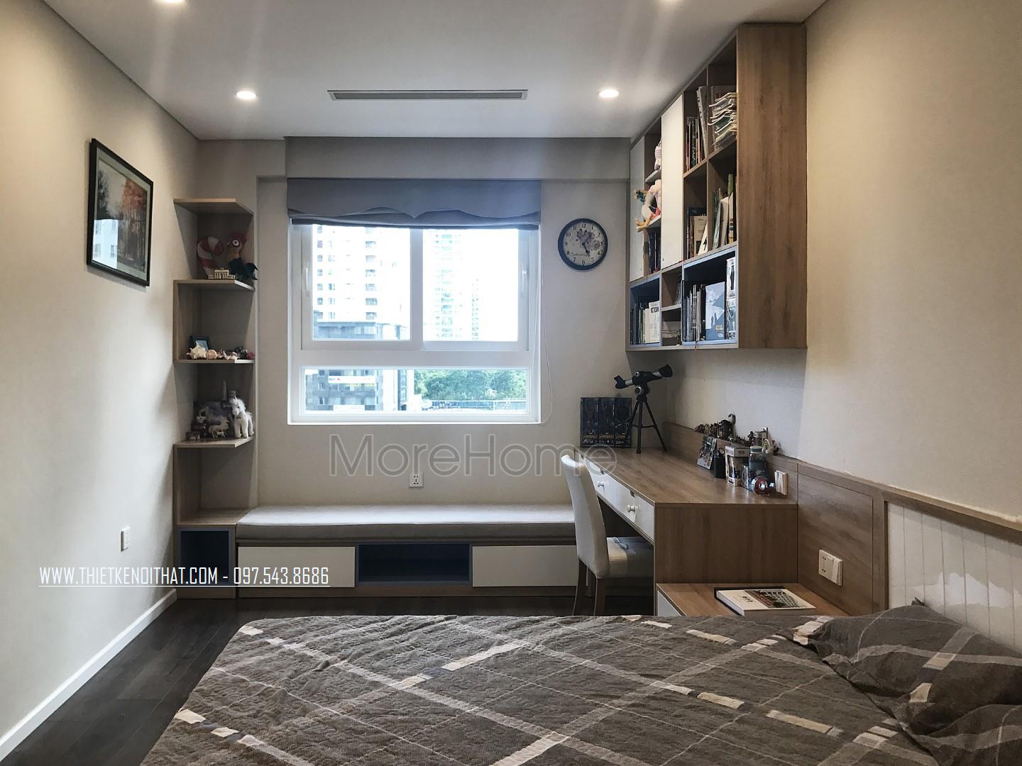 Thi công phòng ngủ con khá hiện đại với mẫu bàn và kệ trang trí đặt sát của sổ. Vẫn là mẫu tủ áo gỗ công nghiệp âm tường, nhưng không gian phòng ngủ này khác hơn là được thiết kế khá sáng tạo và năng động.