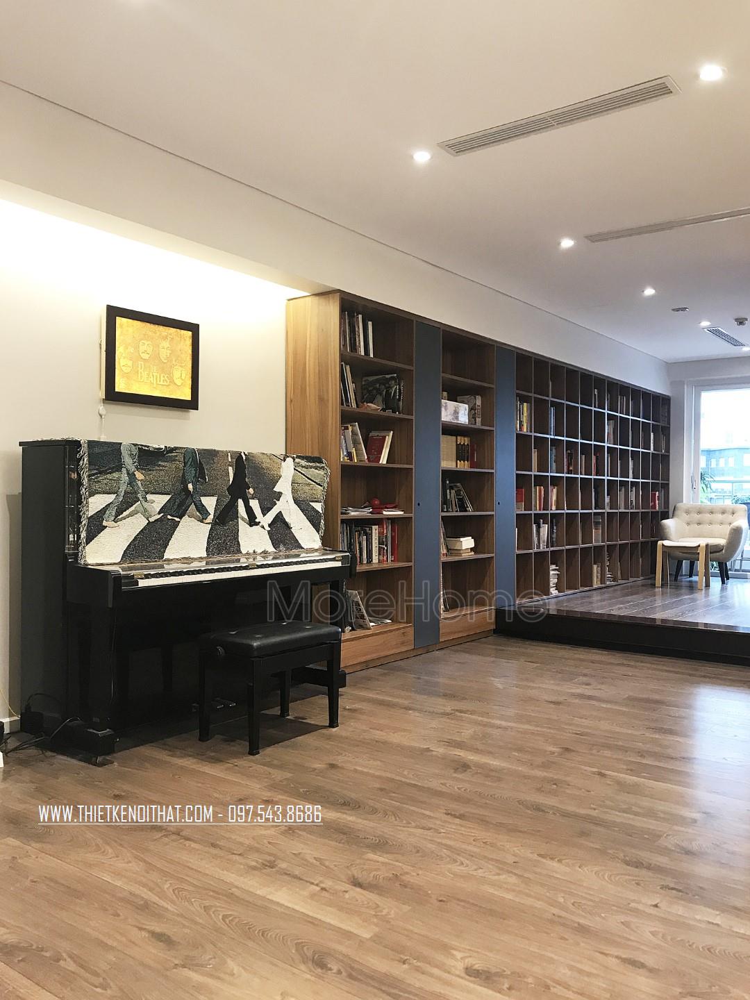 Đi sâu vào bên trái là phòng đọc sách, với hệ tủ sách bằng gỗ công nghiệp tạo cho gia chủ có không gian lưu trữ sách vô tận. Bên cạnh đó KTS thiết kế một chiếc bục bằng gỗ nhằm và một chiếc ghế thư giãn nhằm tạo không gian đọc sách riêng cho gia chủ.