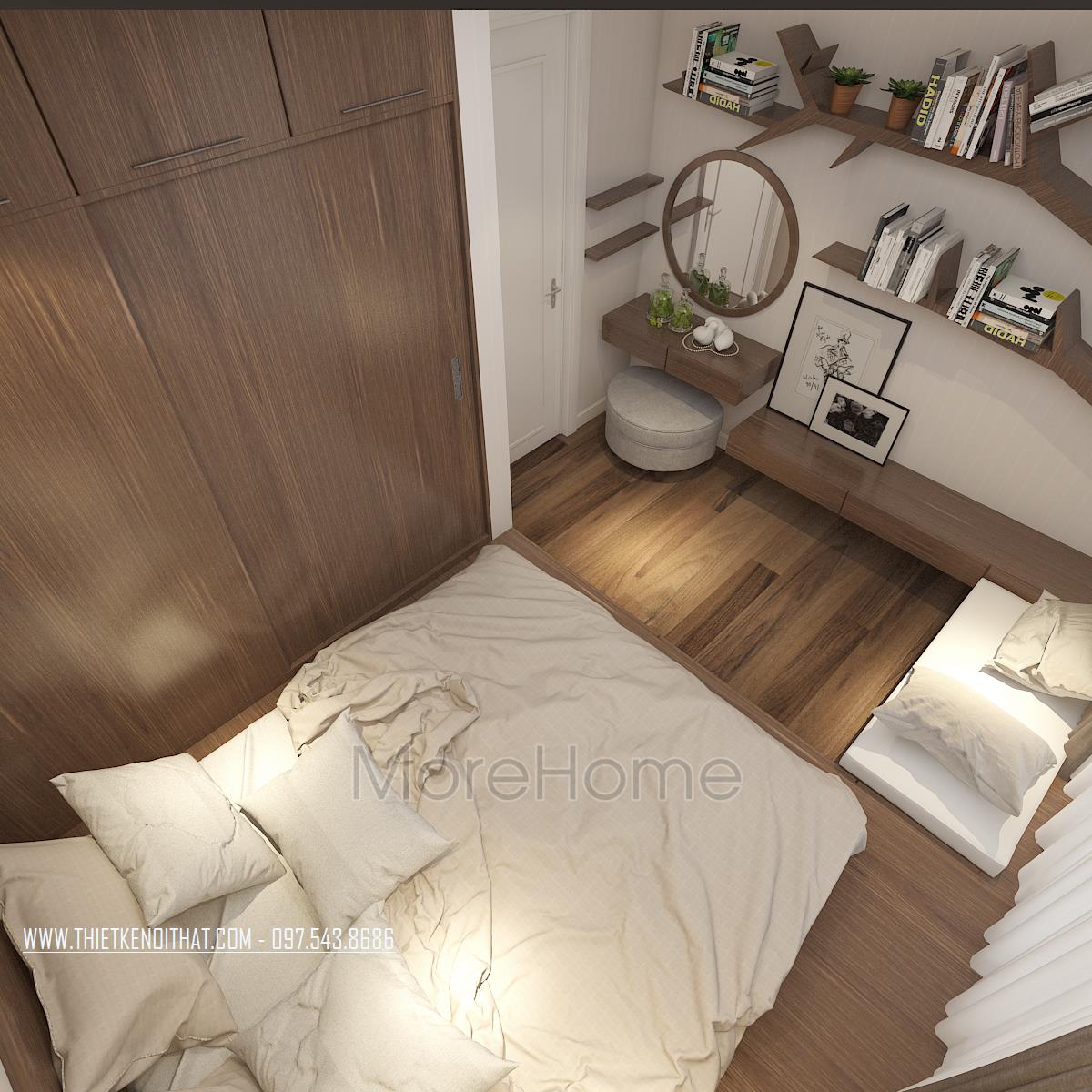 Tiếp đến là thiết kế nội thất phòng ngủ master sát cửa sổ thông thoáng. Đồ nội thất trongphòng chủ yếu được làm từ gỗ vời tủ áo được bố trí song song với giường và cửa sổ. Đối diện với giường là kệ tivi và bàn làm việc. Phía trên bàn làm việc là giá sách được thiết kế cách điệu. Hai bên táp đầu giường là tủ trag trí và cũng có công năng để đồ. Phòng ngủ con cũng được thiết kế tương tự với giường và tủ áo. Tuy nhiên do diện tích hạn hẹp bề ngang nên không thiết kế thêm tap đầu giường, bù lại diện tích chiều sâu là vị trí dành cho bàn học và bàn trang điểm.