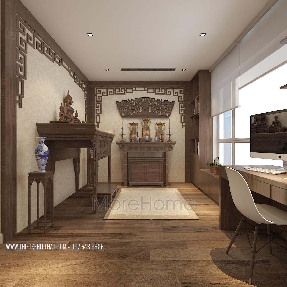 Thiết kế không gian tâm linh như phòng thờ cũng được chủ nhà khá chú trọng và đầu tư nhiều. Thiết kế vuông góc kết hợp, một bên là bàn thờ phật, một bên là bàn thờ gia tiên kết hợp với tủ thờ. Vách cnc phòng thờ là những hoa văn nhấn và tạo sự mềm mại. Sát với cửa sổ là hệ thống tủ kệ trang trí và góc làm việc, thư giãn nho nhỏ cho gia chủ