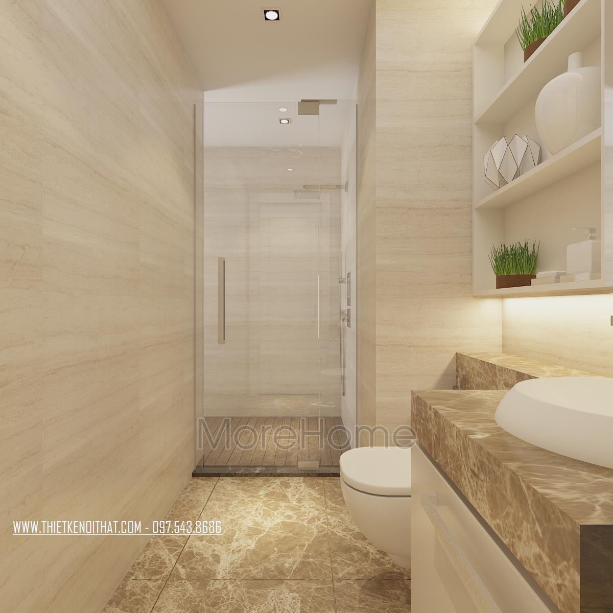 Các phòng tắm đều sử dụng kính cường lực làm vách tắm kính. Đặc tính của kính có thể khiến không gian được nới rộng hơn rất nhiều, đồng thời vách tắm kính cũng giúp không gian vệ sinh được khô dáo